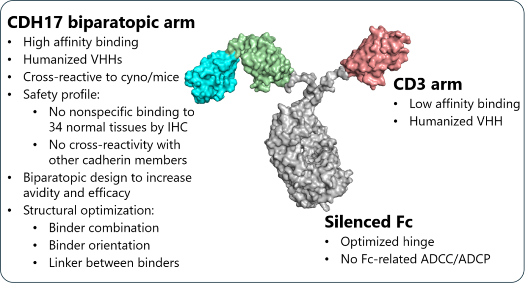 结直肠癌是全球范围内重大的未被满足医疗需求,钙粘蛋白-17(CDH17)在大多数结直肠癌中高表达,与不良预后及生存期缩短相关。在正常肠道组织中,CDH17局限于紧密连接,而在肿瘤中异常高表达且定位改变,使其成为理想的肿瘤治疗靶点。然而,现有TCE在实体瘤中的应用受限于靶点特异性不足、CD3抗体活性调控困难及肿瘤穿透性差等问题。