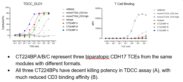 CT224是一款靶向CDH17双互补表位的CD3 T细胞衔接器(TCE)。 通过双表位结合实现对肿瘤的高特异性锚定,并利用筛选优化的低亲和力抗CD3纳米抗体降低传统TCE的毒性风险。
