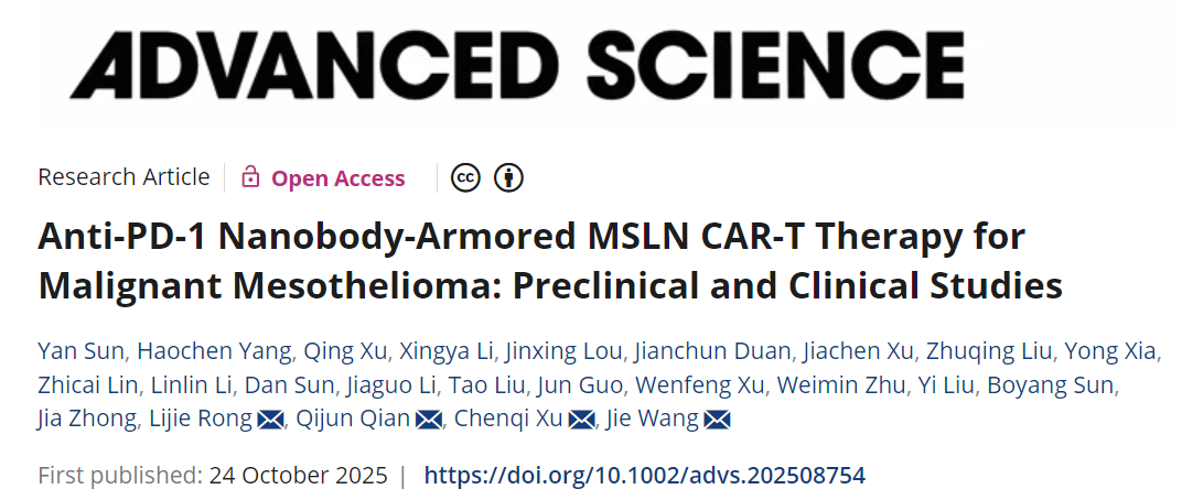 上海细胞治疗集团联合上海大学附属孟超肿瘤医院、中国科学院分子细胞科学卓越创新中心许琛琦教授团队、中国医学科学院肿瘤医院王洁教授团队、同济大学附属上海市第十人民医院许青教授团队及郑州大学第一附属医院李醒亚教授团队完成的国际首个纳米抗体装甲化 CAR-T 细胞(NAC-T)的临床研究,在《Advanced Science》(IF=14.1)发布最新研究数据。