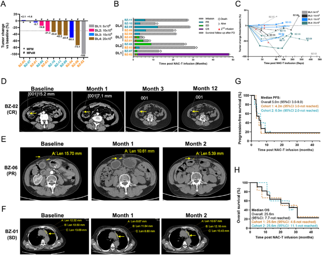 在剂量递增临床Ⅰ期试验中,11例标准治疗失败的恶性间皮瘤患者接受了 5-20×10⁶/kg 剂量的 NAC-T 细胞输注。研究结果显示,该疗法安全性良好,未观察到剂量限制性毒性。患者总体响应率(ORR)达 63.6%,其中 1 例实现完全缓解(CR),6例部分缓解(PR),4 例病情稳定(SD),疾病控制率(DCR)高达100%。