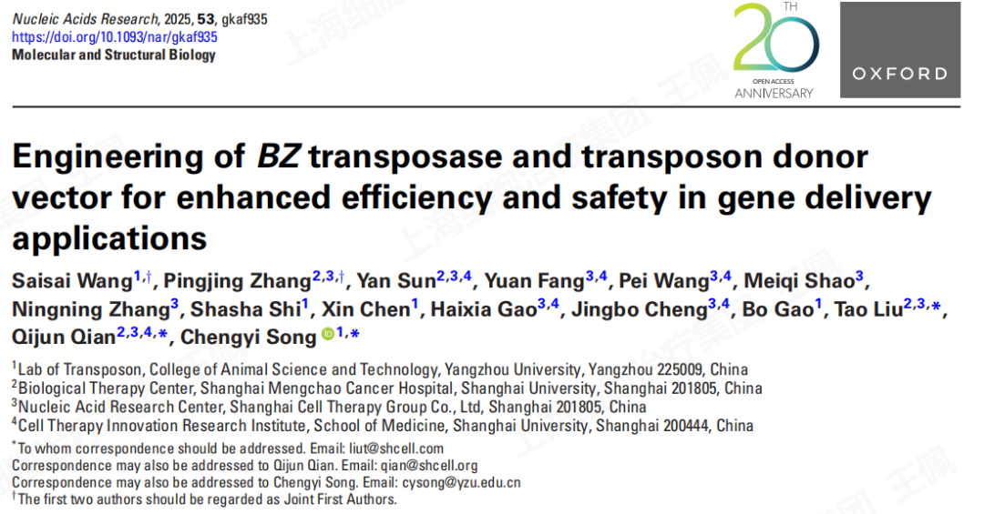 上海细胞治疗集团联合扬州大学宋成义教授团队、上海大学孟超肿瘤医院及上海大学医学院细胞治疗创新研究院,研究针对BZ转座系统(源于斑马鱼)进行精准工程化改造,成功开发出高效、安全升级版 Baize(BZ)的转座子系统,为基因治疗提供了更具潜力的新型递送工具。