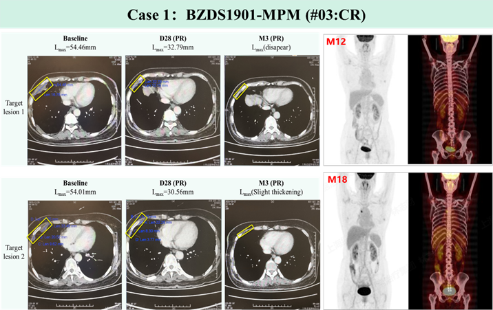 晚期恶性间皮瘤患者治疗难度大,标准治疗失败后中位生存期仅1年,5年生存率不足10%。作为全球首个自分泌PD1纳米抗体靶向间皮素CAR-T疗法,基于自主JL-闪-CAR-T工艺制备的BZDS1901展现出显著临床疗效。累计入组的12例标准治疗失败患者中,疾病控制率高达91.7%,客观缓解率41.7%,完全缓解率16.7%,其中1例患者持续完全缓解已达24个月。全球首个自分泌PD1纳米抗体靶向间皮素CAR-T疗法治愈的第1例恶性间皮瘤患者已持续完全缓解达62个月,为MSLN阳性实体肿瘤患者带来治愈性治疗希望。