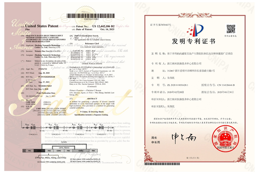 集团自主研发的VHHMAb®人工智能纳米抗体发现平台,于2025年成功获得中国与美国双国专利授权(中国专利号:ZL 2020 8 0031628.1;美国专利号:Patent No.: US 12,442,106 B2),解锁抗体药物开发新范式。基于该平台,集团实现海外企业专利授权、商业合作及多靶点纳米抗体管线布局,涵盖泛肿瘤、自身免疫疾病等多个治疗领域。