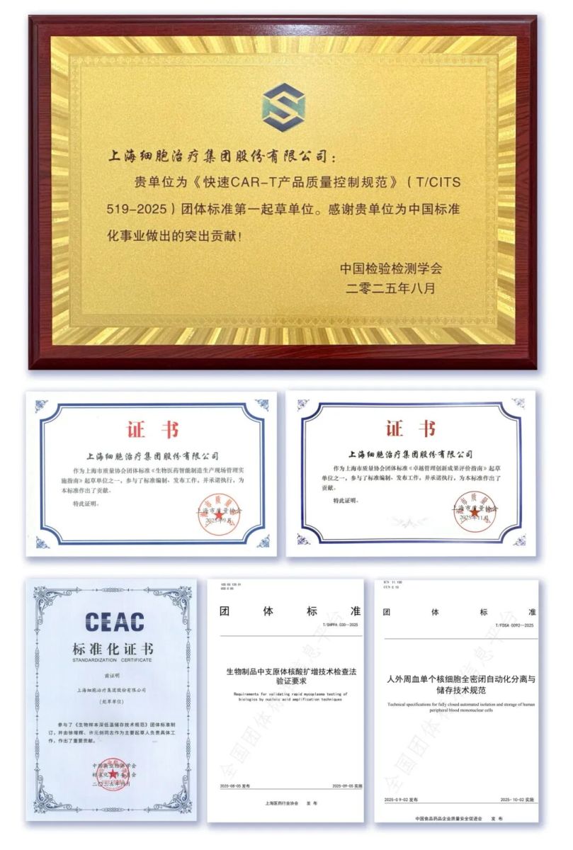 2025年,集团主导发布了6项关键技术标准,覆盖快速制备CAR-T产品质量控制、生物医药智能制造、生物制品支原体NAT检查法方法验证、全密闭自动分离与储存等关键环节,为行业提供了可操作、可评价的技术准则。其中,作为第一起草单位制定的《快速CAR-T产品质量控制规范》团体标准,经中国检验检测学会发布后,成为行业质量控制的重要参考。