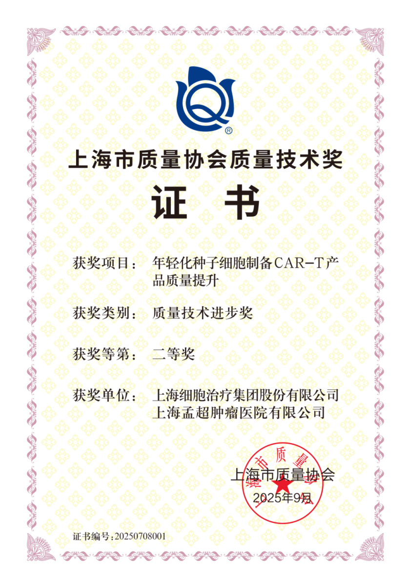 凭借在“细胞药物全链条质量管控”与“质量文化建设”方面的卓越表现,集团荣膺上海市市场监督管理局与上海市经济和信息化委员会联合组织的“2025年上海市重点产品质量攻关项目成果一等奖”及中国医药质量管理协会颁发的“质量管理匠心企业”称号。以药品级质量控制标准,从源头确保细胞治疗原材料和产品的活性与稳定性,树立了行业质量典范。