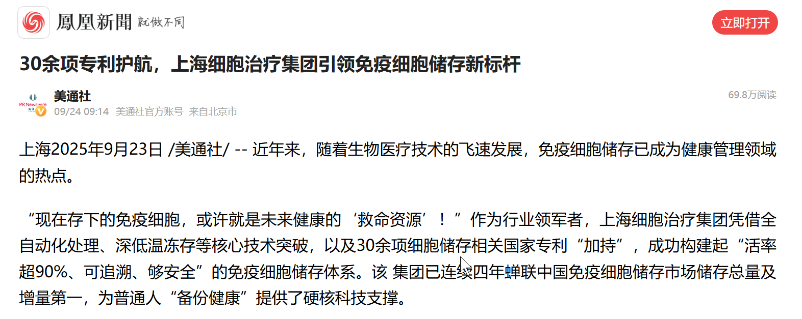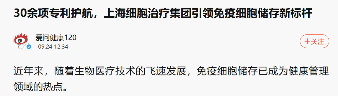 随着科技发展,细胞疗法通过调动和增强人体自身的免疫力量,在全身多个系统疾病的治疗中展现出令人瞩目的成果。近日,上海细胞治疗集团作为细胞大健康“行业领军者”(凤凰新闻原文)获得了多家媒体的关注和报道。