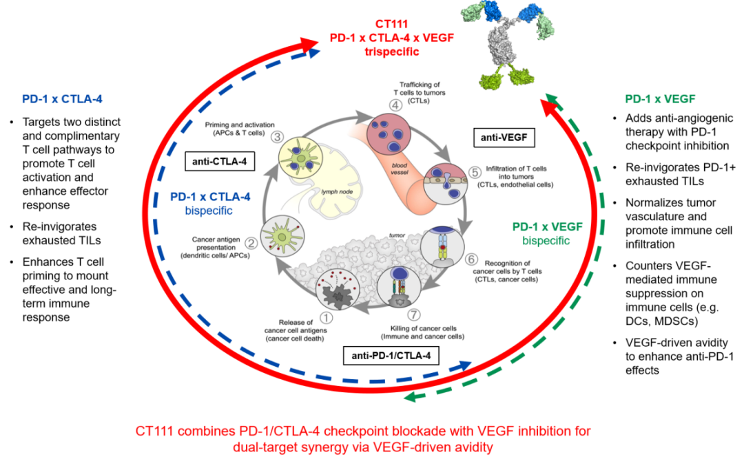 背景介绍:PD-1、CTLA-4和VEGF是肿瘤免疫治疗中已获临床验证的关键靶点,三者在抗肿瘤免疫循环反应中发挥互补作用。目前双特异性抗体和多靶点联合治疗虽已展现临床潜力,但在抗肿瘤疗效持续性和总体生存获益上仍有差距。CT111通过多特异性抗体的协同结合特性,将抗PD-1(恢复效应T细胞活性)、抗CTLA-4(T细胞启动/增殖)以及抗VEGF(抑制肿瘤血管生成)功能集于一体,有望实现更优的生物学协同效应与临床获益。