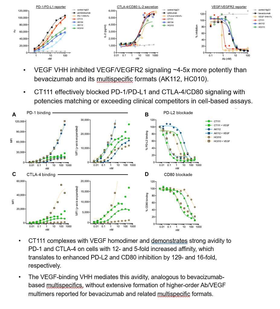 摘要题目:CT111, a PD-1 x CTLA-4 x VEGF trispecific antibody, demonstrates potent anti-tumor efficacy through synergistic immune checkpoint blockade and VEGF inhibition with cooperative avidity