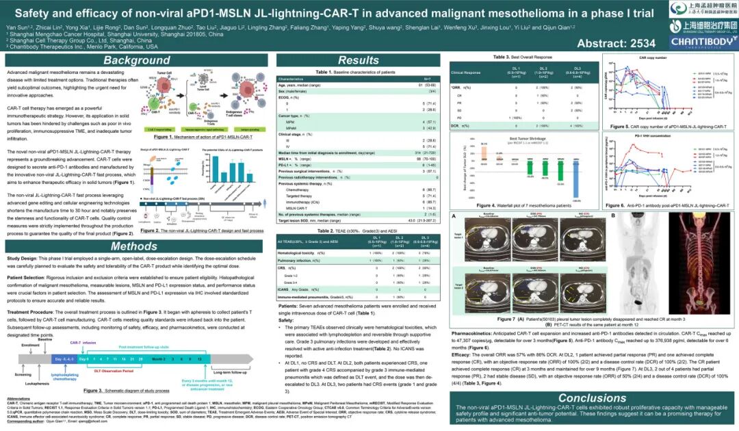 晚期恶性间皮瘤患者治疗难度大,标准治疗失败后中位生存期仅1年,5年生存率不足10%。作为全球首个自分泌PD1纳米抗体靶向间皮素CAR-T疗法,基于自主JL-闪-CAR-T工艺制备的BZDS1901展现出显著临床疗效。累计入组的12例标准治疗失败患者中,疾病控制率高达91.7%,客观缓解率41.7%,完全缓解率16.7%,其中1例患者持续完全缓解已达24个月。全球首个自分泌PD1纳米抗体靶向间皮素CAR-T疗法治愈的第1例恶性间皮瘤患者已持续完全缓解达62个月,为MSLN阳性实体肿瘤患者带来治愈性治疗希望。