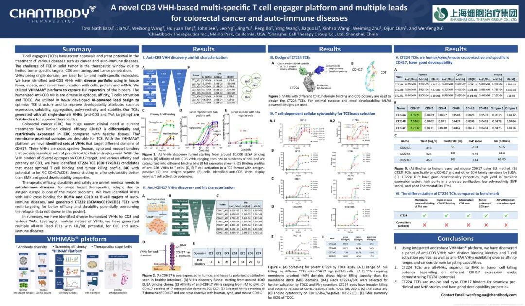 平台开发的CD19*CD22双靶点、EGFR等靶点的纳米抗体已与国内外企业达成授权许可及共同开发合作,开启纳米抗体商务授权合作之路。同时,布局的三款具有全球竞争力的多靶点纳米抗体产品管线——靶向PD-1/CTLA-4/VEGF的三特异性抗体CT111、靶向CD19/BCMA的双靶点TCE抗体CT222以及针对CDH17双表位TCE抗体CT224的相关研究成果分别于2025年4月、11月及12月在第116届2025年美国癌症研究协会年会(AACR)、第40届癌症免疫治疗学会年会(SITC)、抗体工程和药物年会(AET)等国际学术会议上发布,获得全球行业广泛关注。