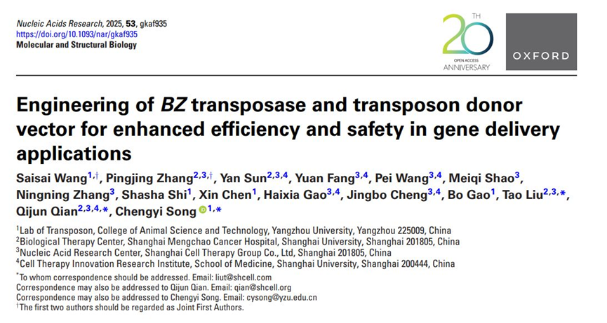 2025年,平台在持续优化大片段转座子系统,与扬州大学合作成功开发出高效安全的升级版Baize(BZ)的转座子系统,为基因治疗提供了更具潜力的新型递送工具,该研究成果发表在2025年9月23日在国际权威期刊《Nucleic Acids Research》(IF=13.1)。同时CRISPR/Cas祖先核酸酶的系统挖掘与定向进化取得了重大进展,挖掘的小型TnpB核酸酶通过AI辅助定向进化活性提升253%,优于目前国际上报道的ISYmu TnpB核酸酶,达到ISDra2 AI5.6的相当水平。