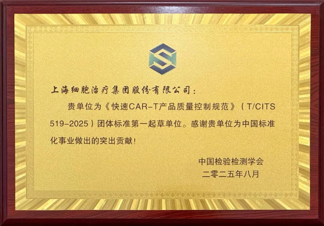 中国检验检测学会团体标准《快速CAR-T细胞产品质量控制规范》第一起草单位
