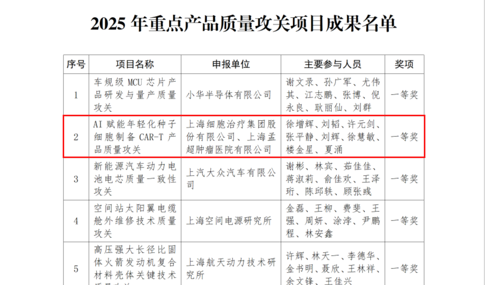 2025年上海市重点产品质量攻关项目成果一等奖